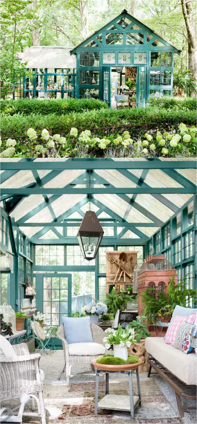 This stunning shed inspires us to dream big: 139 windows plus five French doors personally mapped out  like a giant jigsaw puzzle, and the green trim color – Tarrytown Green by Benjamin Moore – that both pops and blends into the surroundings.