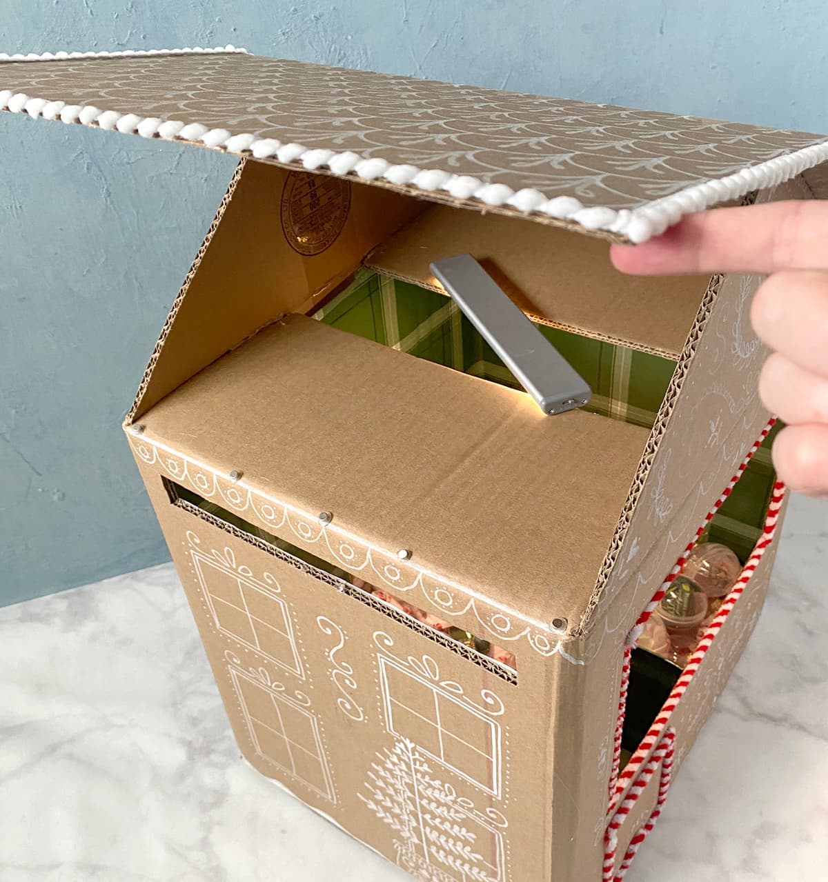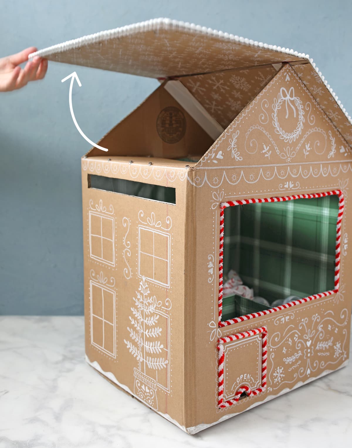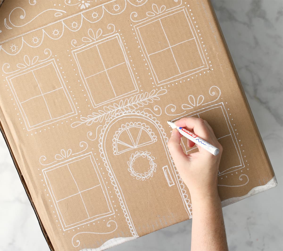 Step 4: Use a white paint pen to draw gingerbread house details onto the cardboard box. This was my first time using an Edding paint pen and I have to say I was so impressed! I drew A LOT with it and it just kept pumping out ink like a champ.