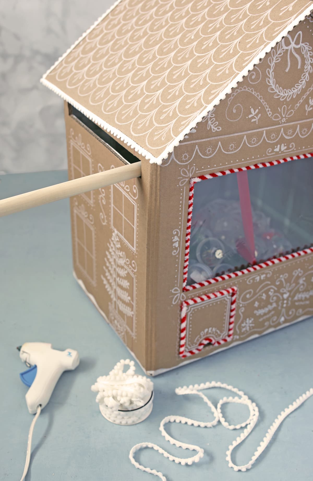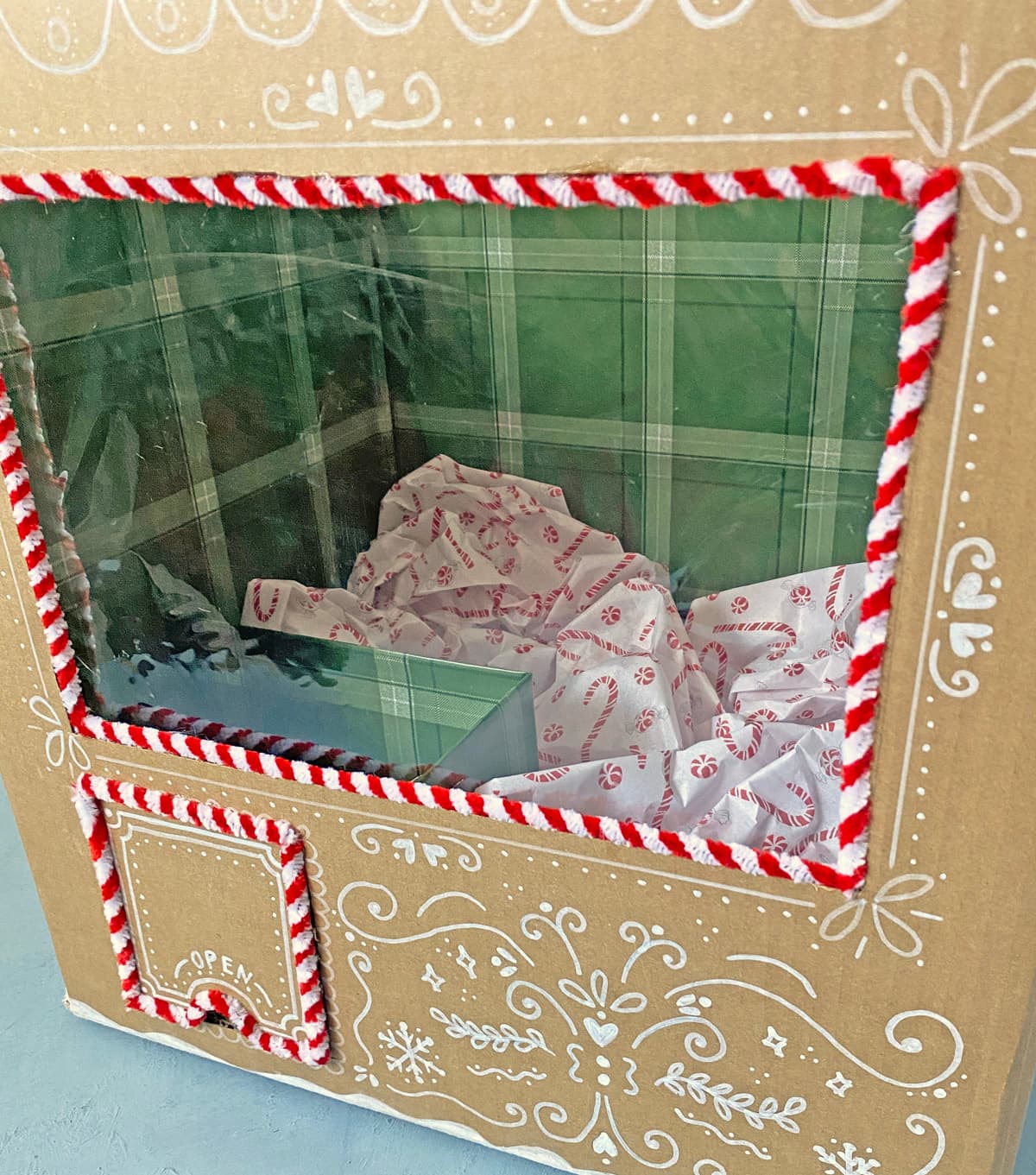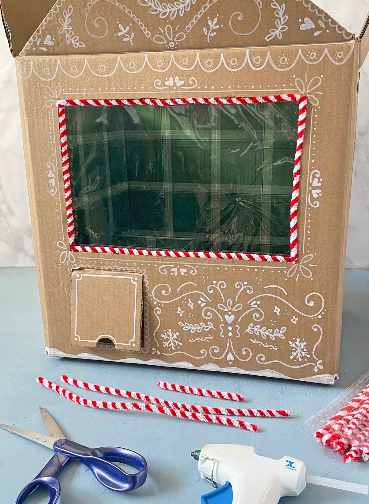 Step 7: Use hot glue to attach the candy cane pipe cleaner around the window and prize flap.