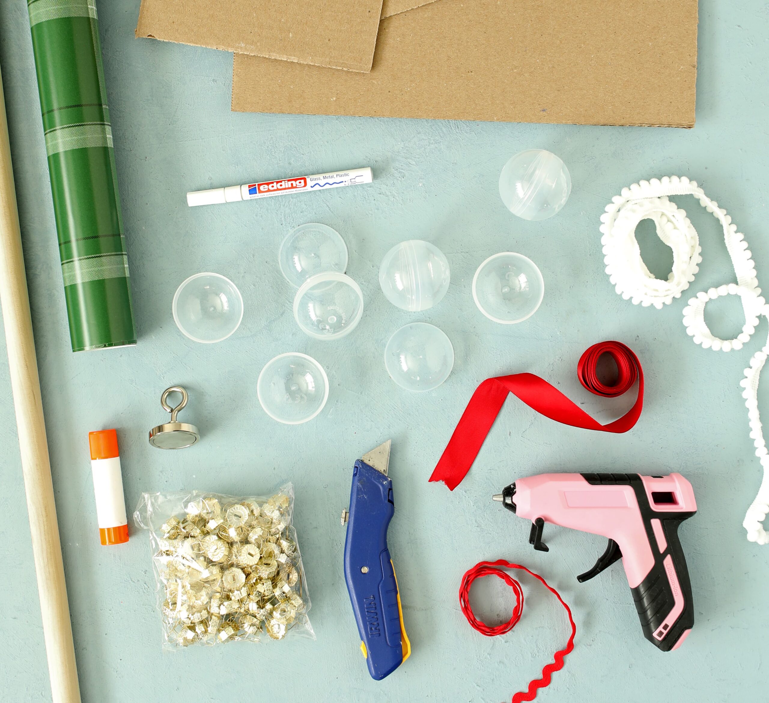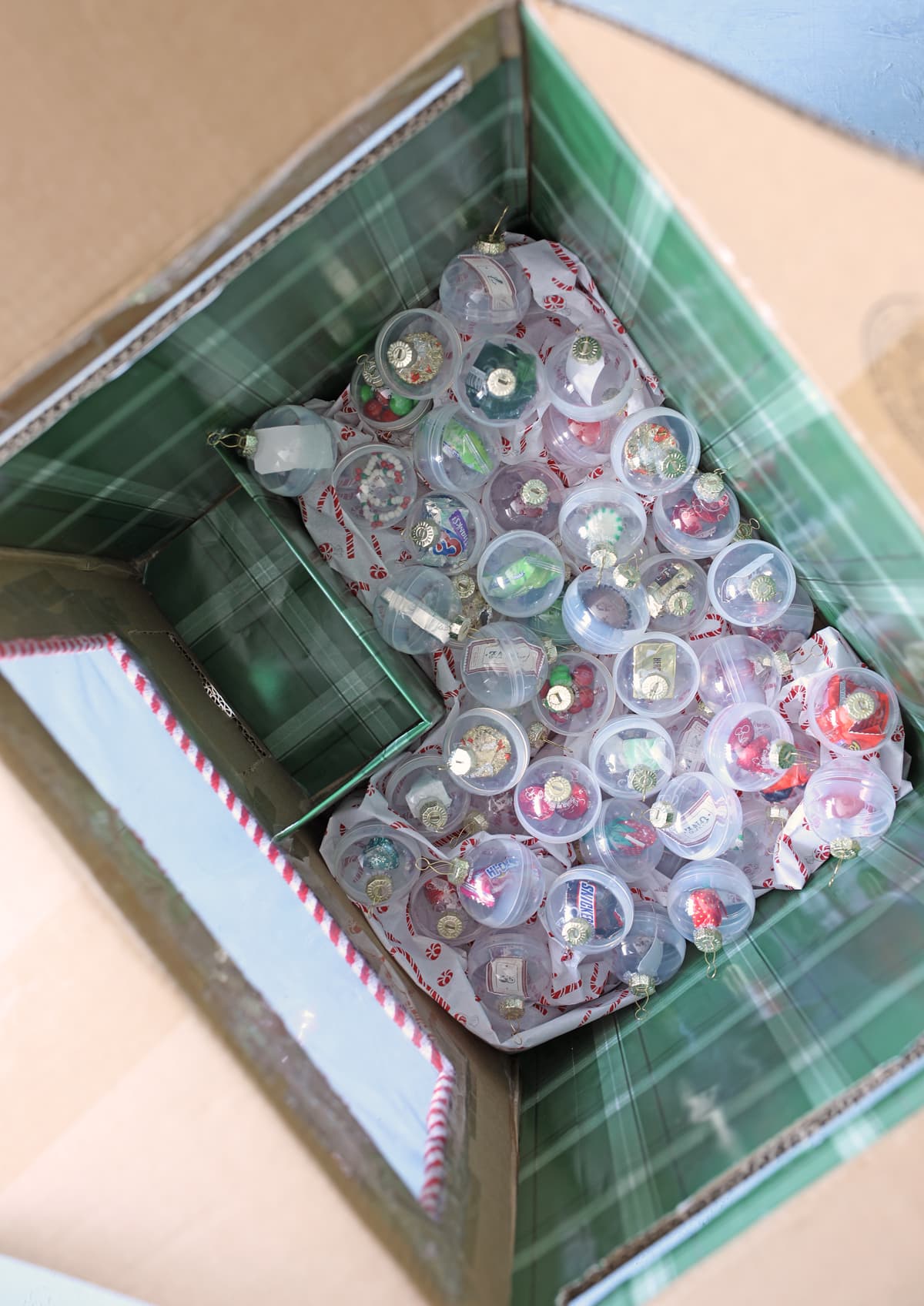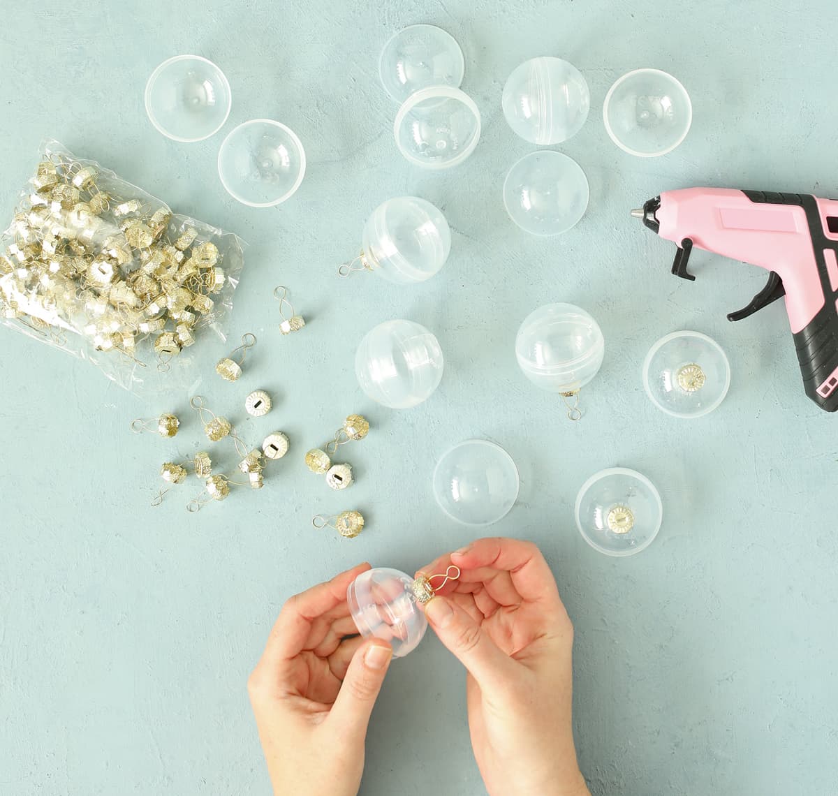 Step 8: Let’s get the prize balls ready! Each ball has an outie half and an innie half. Glue an ornament topper to the outie half of all of the balls you want to use. This seemed straightforward until I tried it. The ornament topper has a jagged edge and doesn’t want to stick to the curved surface of the plastic balls, so I found the thing that worked best was LOADING the entire ornament topper full of glue. It then becomes a burning hot piece of metal, so only hold it by the metal hanging piece, then use two popsicle sticks to press it down onto the plastic ball.