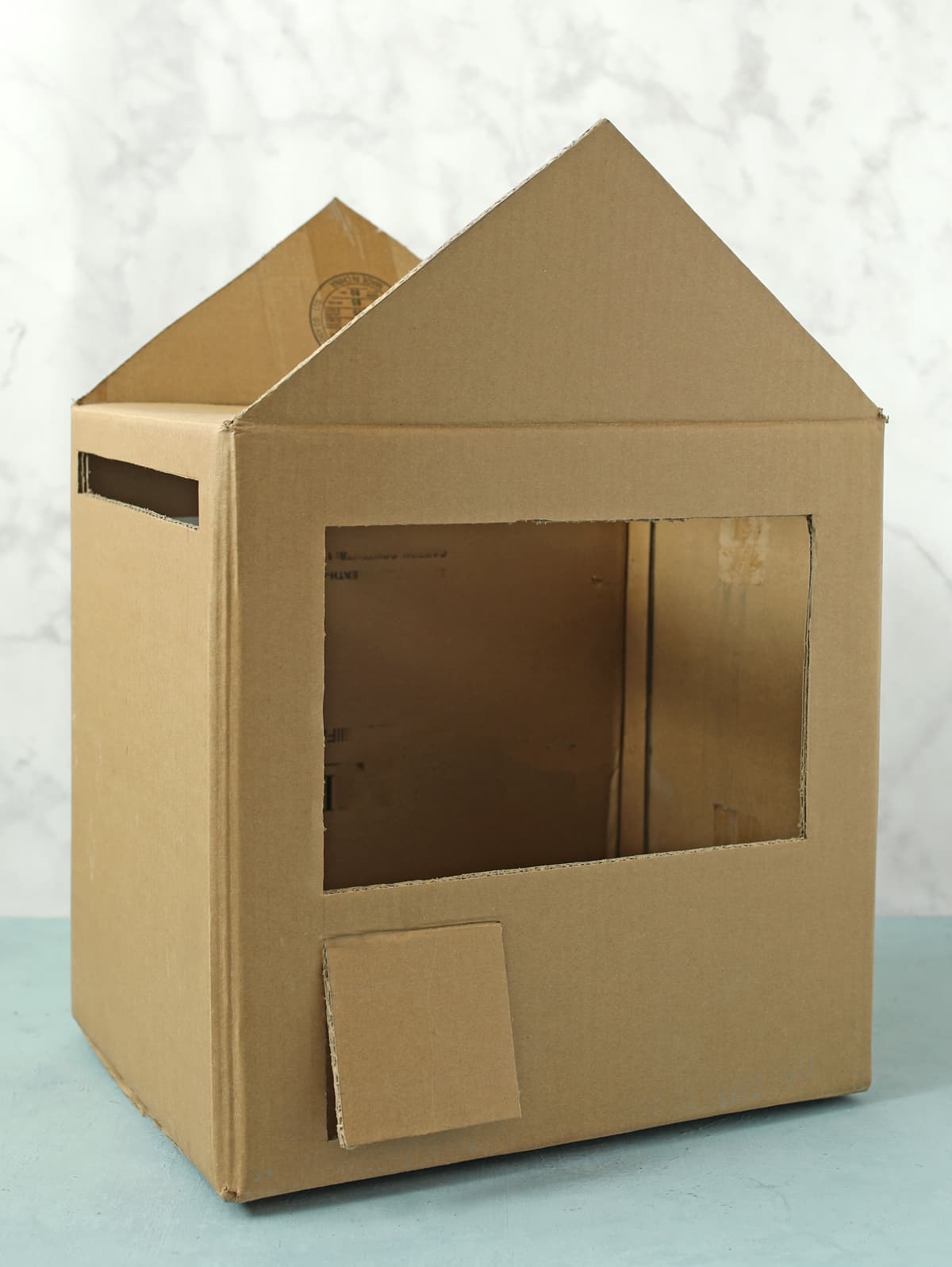 Step 1: Find a good cardboard box, you know what I mean? A GOOD box. Mine measured 16x16x12 inches but you can use whatever size you want. Carefully open the box along the seam line and flip it inside out so that all of the printed stuff is on the inside and you have clean cardboard on the outside. Glue the box back together, then cut two of the top flaps into triangle shapes so you can make it look like a house.
