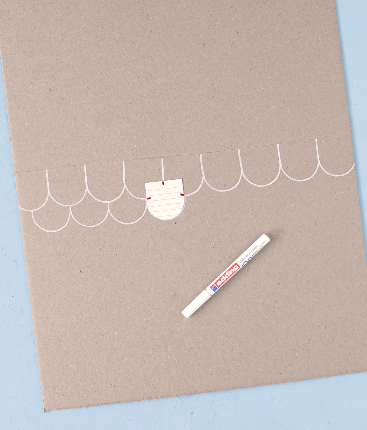 Then decorate it using the same white paint pen. I cut out a little cardstock template to use to help me line up the scallops. Def recommend. Saved me a ton of time!