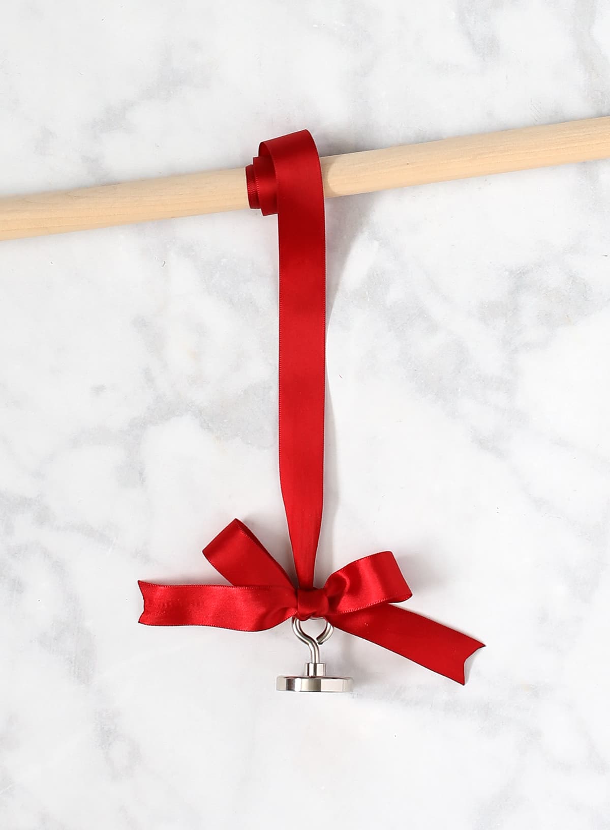To make the claw mechanism, tie a ribbon to the loop on the fishing magnet, then glue the other end of the ribbon to the center of the wooden dowel. Add a bow for cuteness.