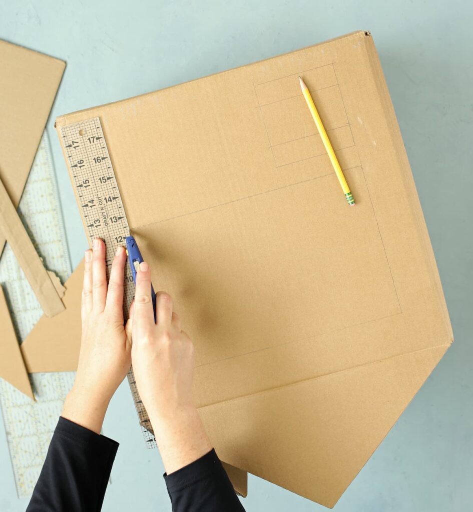 Step 6: Now we need to make a roof. This is where you’ll need a second piece of cardboard (bonus points if it doesn’t have any markings on it). The roof is going to be the size of your triangles plus a couple inches so it overhangs. Cut a score mark down the center so you can fold it and make the roof peak shape.