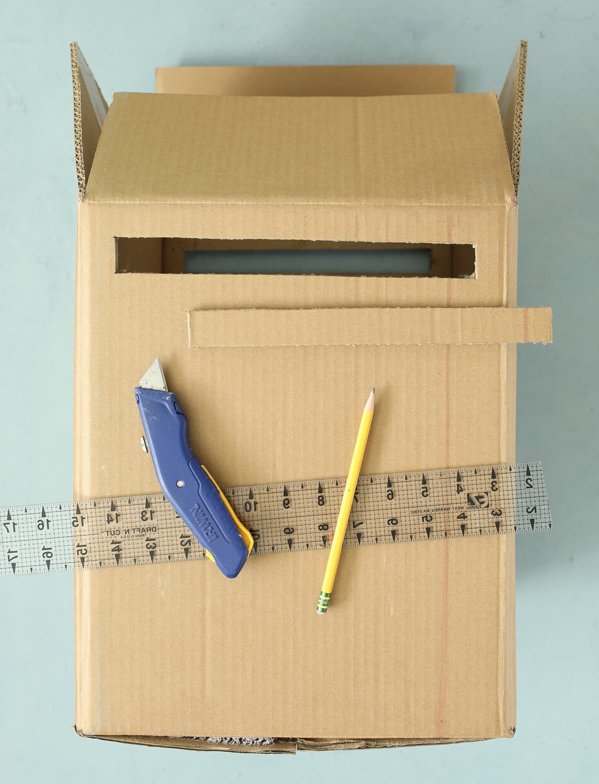 Step 2: Cut a window into the front of the box (12 x 7 inches) and you’ll also want to cut a flap piece (4 x 4 inches) below the window. Three of the sides are cut all the way through, but the top edge is just scored and NOT cut all the way through. This makes it so the flap can open and close.