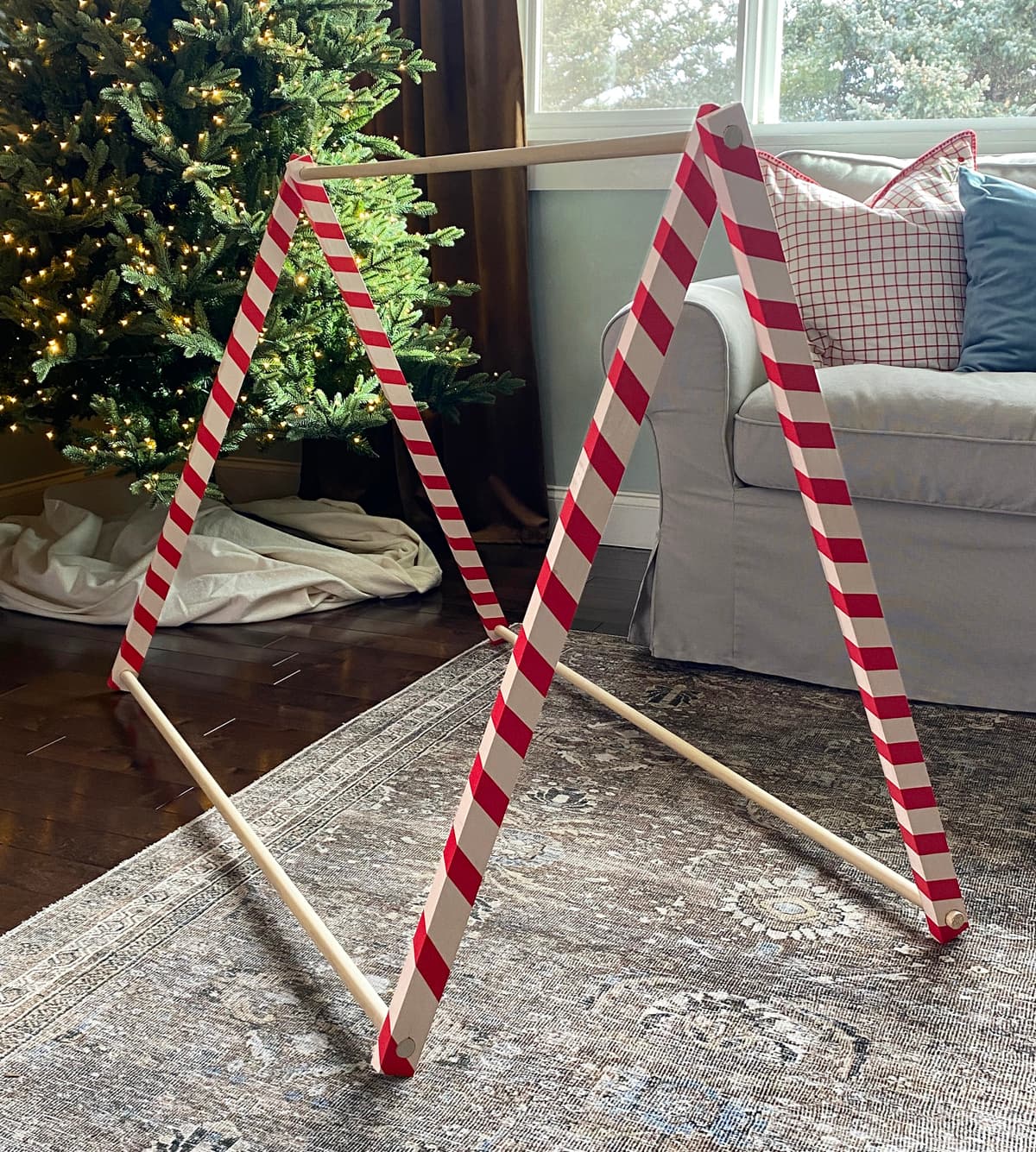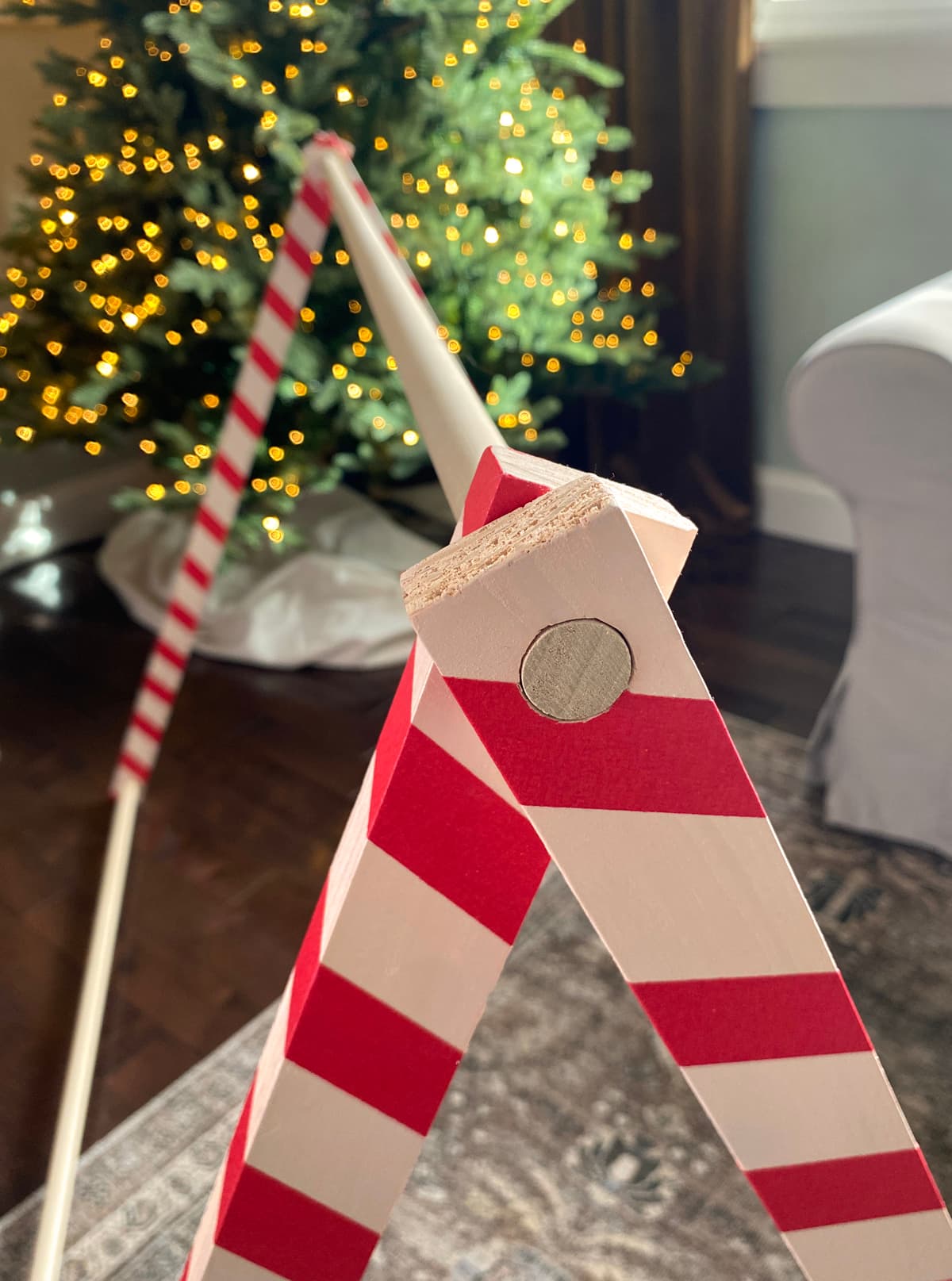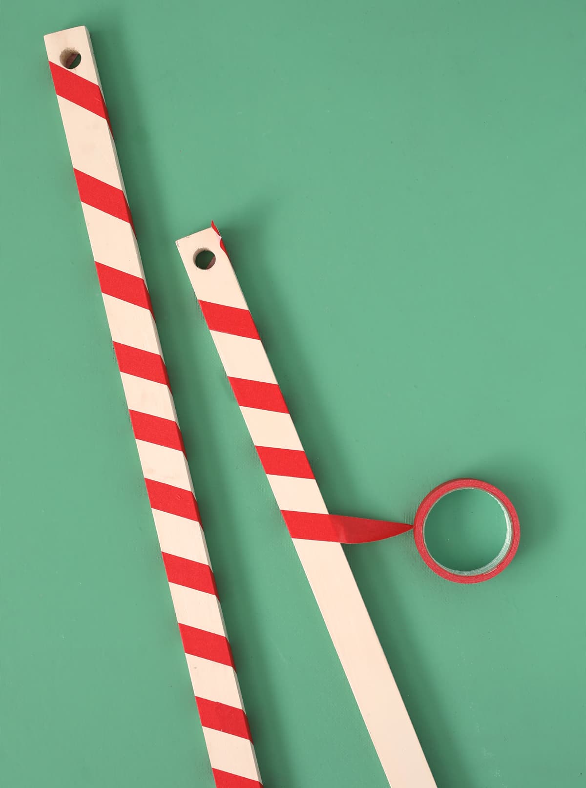 Step 4: Paint the wood. I chose a very light pink spray paint (color name: Pink Peony). Then wrap the boards with red masking tape so they look like candy canes. If you can’t find red masking tape, paint the boards red, then use white masking tape for the stripe. This worked so well and has such a big visual impact. I definitely wouldn’t skip this step!