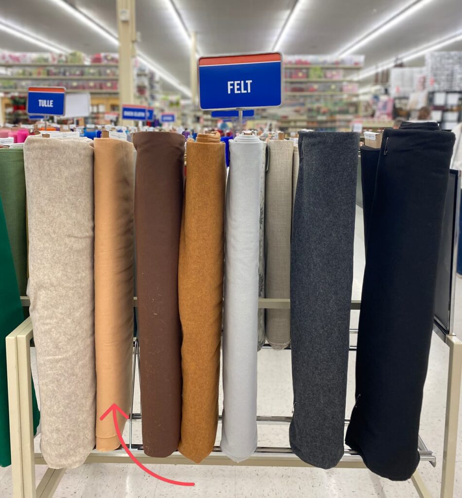 The felt is located in the fabric section. If you’ve never bought fabric before, just grab the whole bolt of the felt and take it to the counter in the fabric section and they will cut the amount you need. Ask for 1 2/3 yards. I chose the lighter tan color, but they also had a nice camel color called “Copper Canyon” that you could choose. You can see both colors in this photo: