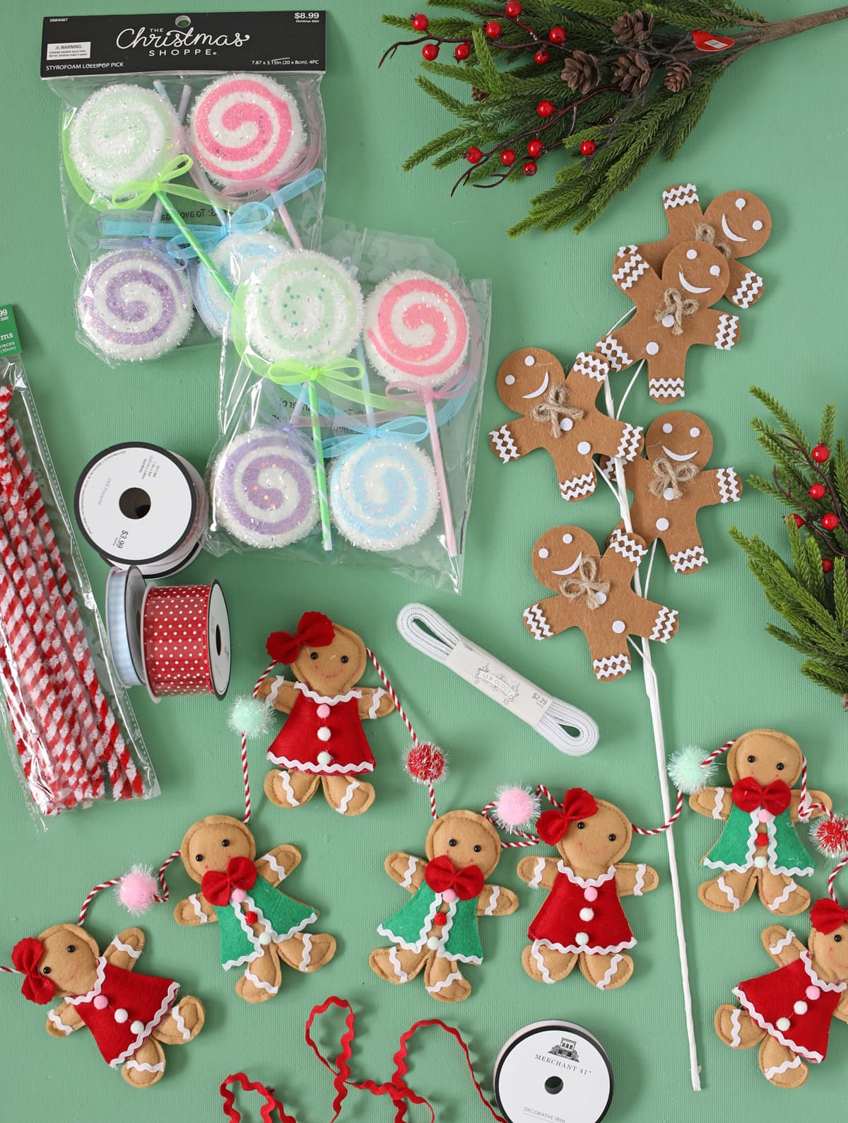 Hobby Lobby has SO MANY cute gingerbread candy decorations that it was really hard to choose what to use. Definitely go walk the aisles to see what accessories strike your fancy. Seriously, there are so many fun options. It would also be fun to take your kids so they can pick out some candies.