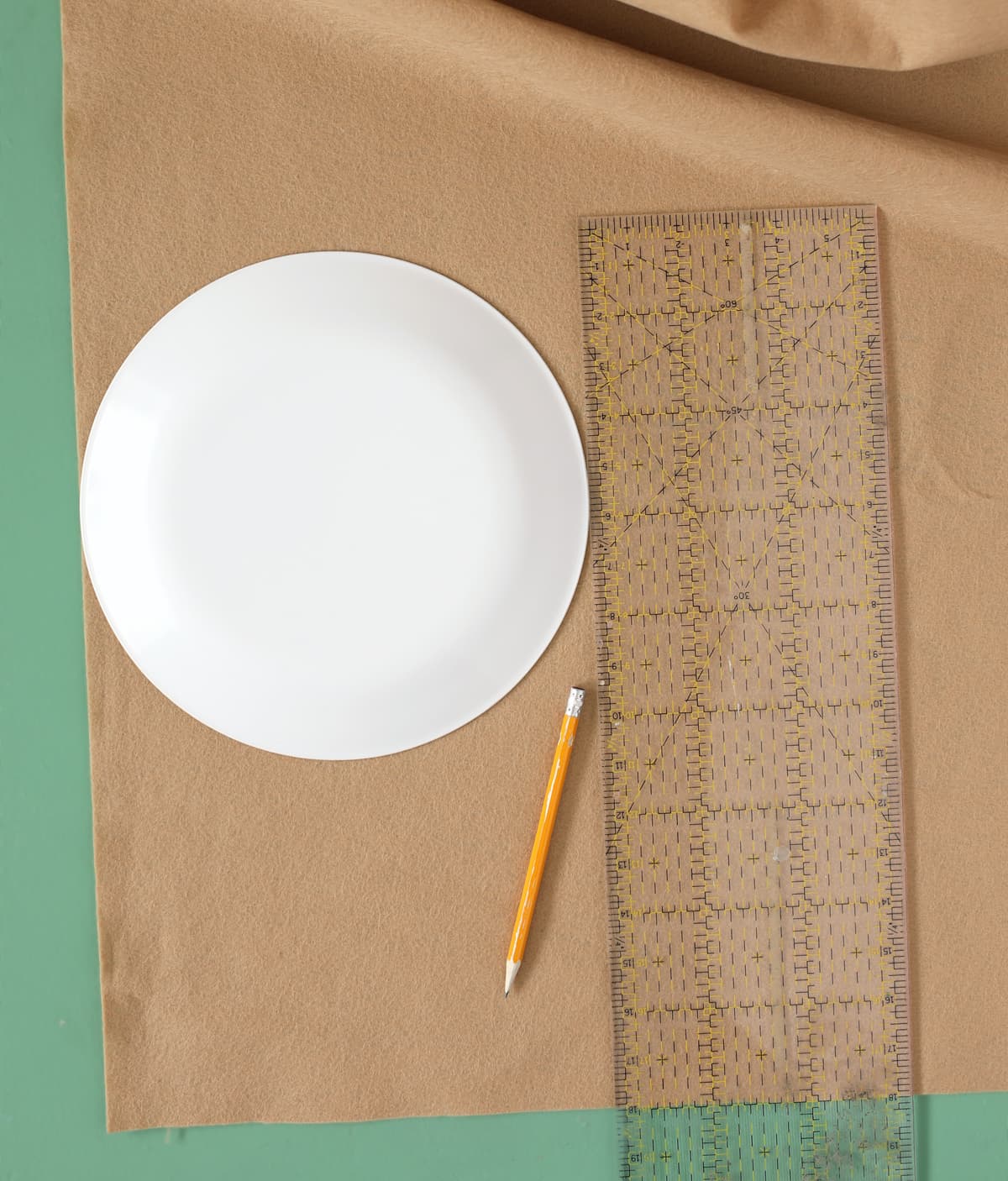 Step 3: Using the extra brown felt fabric, cut out a window shape. I used a dinner plate to get a rounded shape, then drew straight lines down to make cute arched windows. My windows ended up measuring about 10.5 inches wide and 17 inches tall.