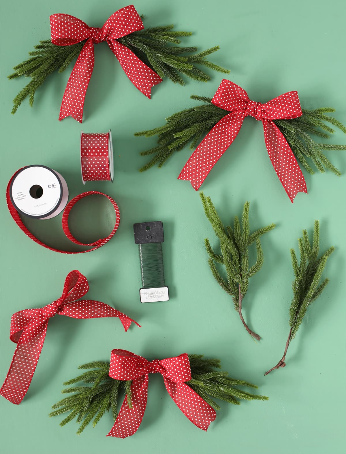 Step 6: Make little greenery swags to go above each window. The floral picks I bought had four bunches of pine, one bunch of pine cones and two bunches of berries all attached together, so I tore apart the picks into their smaller individual parts, then used florist wire to attach two pine sprigs together. (I’ll save the pine cones and berries for another project). I finished off the swags with a big red bow in the center and they turned out so cute!