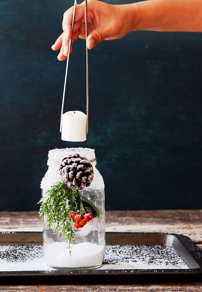 Step 3: add candles to your snowy DIY mason jar centerpieces