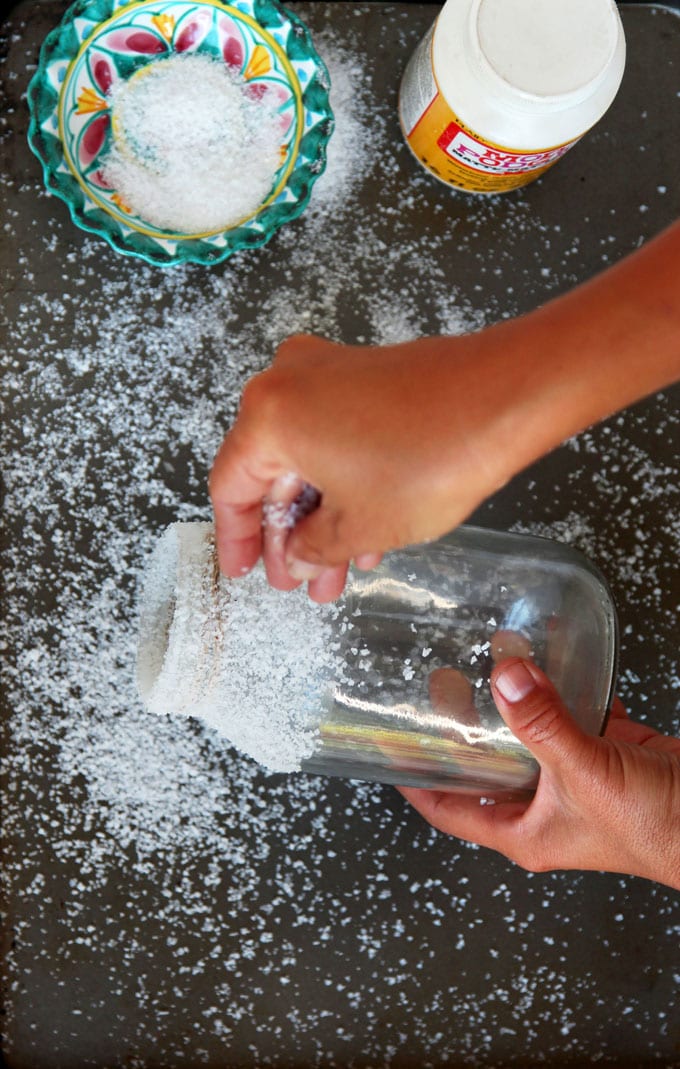 Take a handful of salt, sprinkle onto the glue coated surface as you rotate the jar. Don’t touch the glue and salt coated surface.