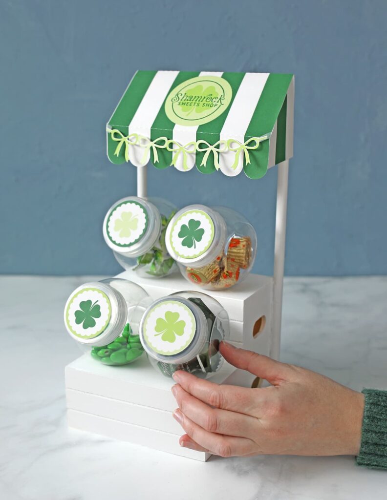 Make a cute candy display for St. Patrick’s Day using simple items from Dollar Tree.