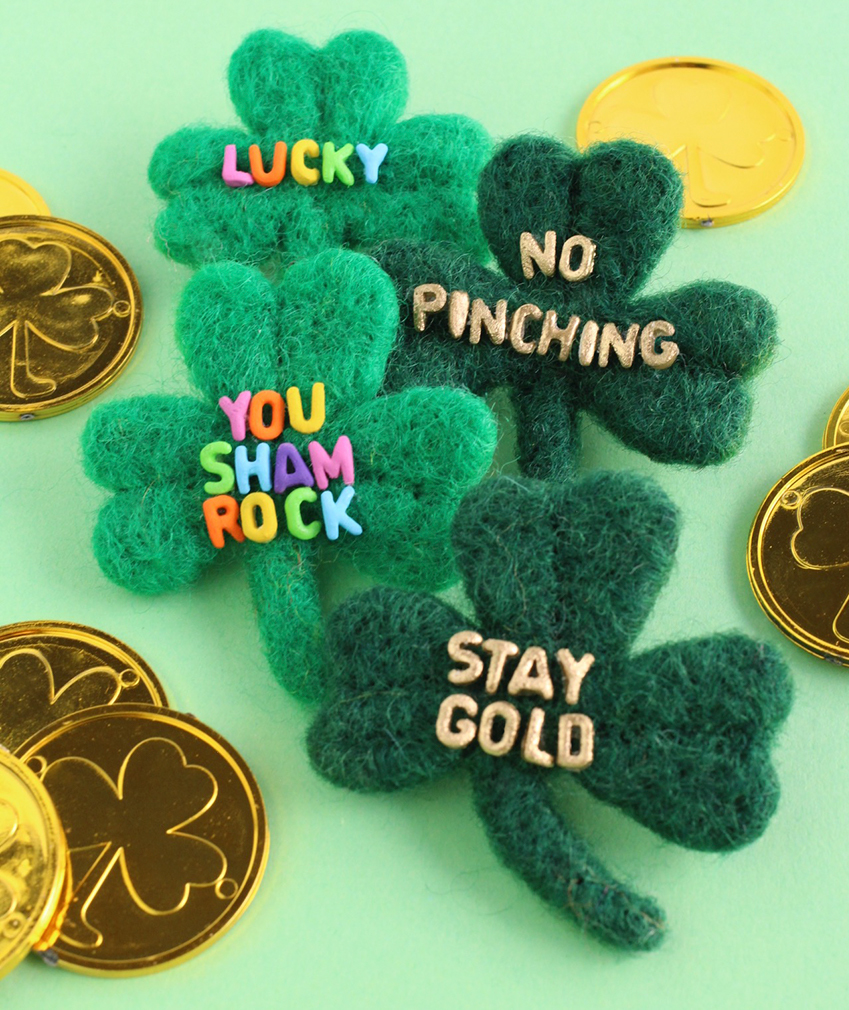 Wear these cute DIY shamrock pins with cute words on them to be pinch-proof on St. Patrick’s Day.