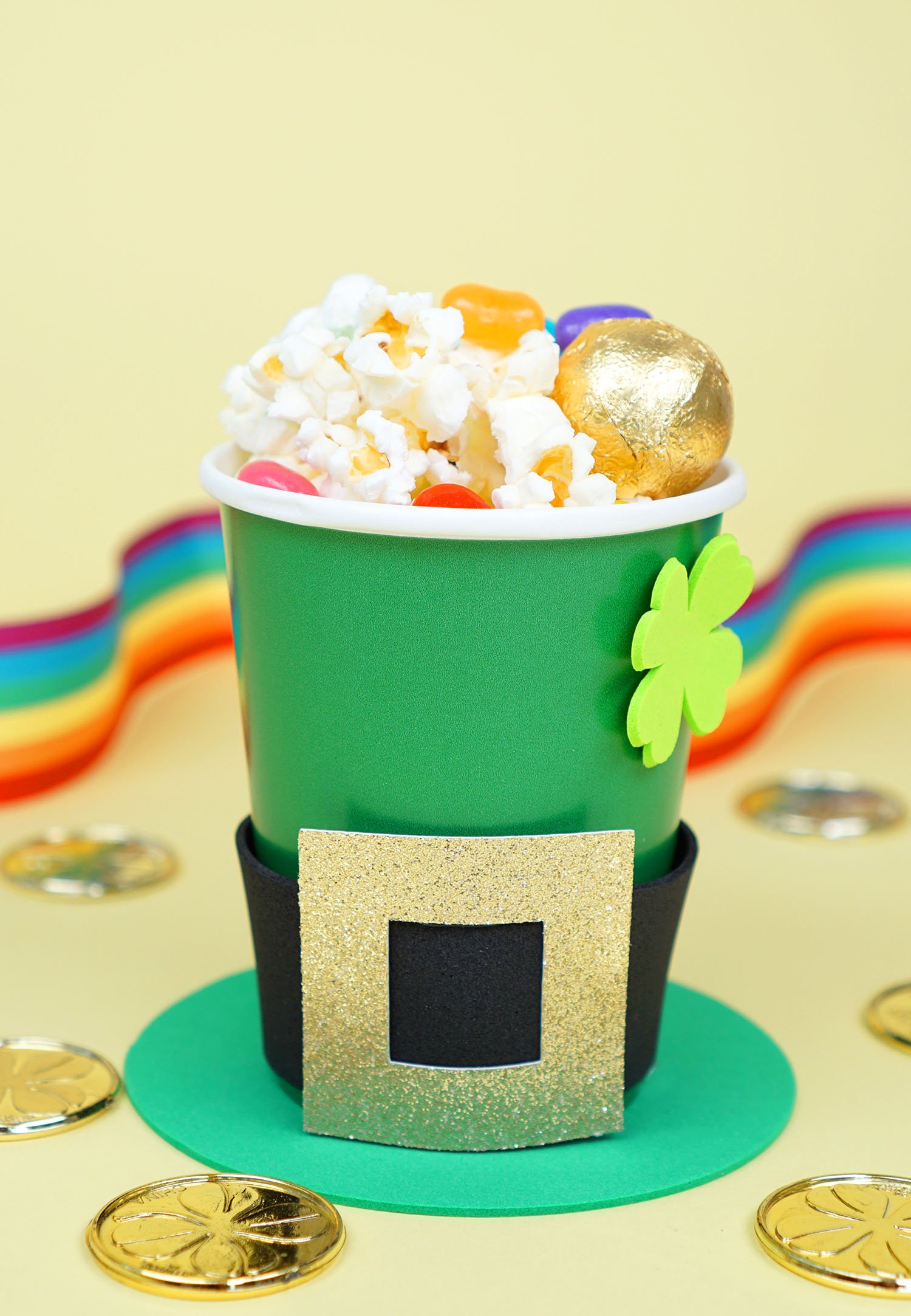 Turn a green cup into a cute leprechaun hat to use for giving out treats.