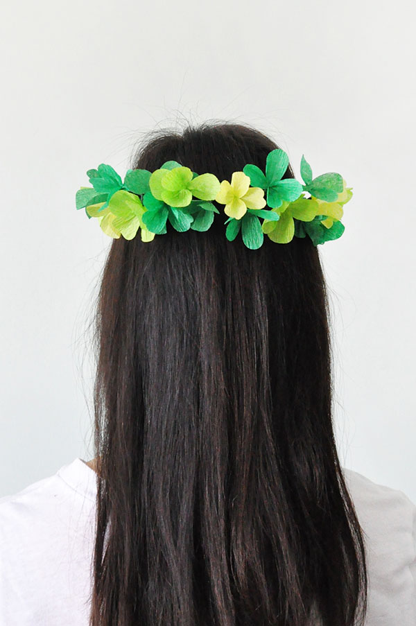 Make pretty crepe paper clovers and turn them into a fairy-esque crown to wear on St. Patrick’s Day.