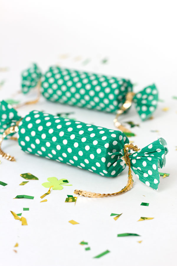 Turn cardboard tubes and tissue paper into fun poppers filled with gold and green confetti.