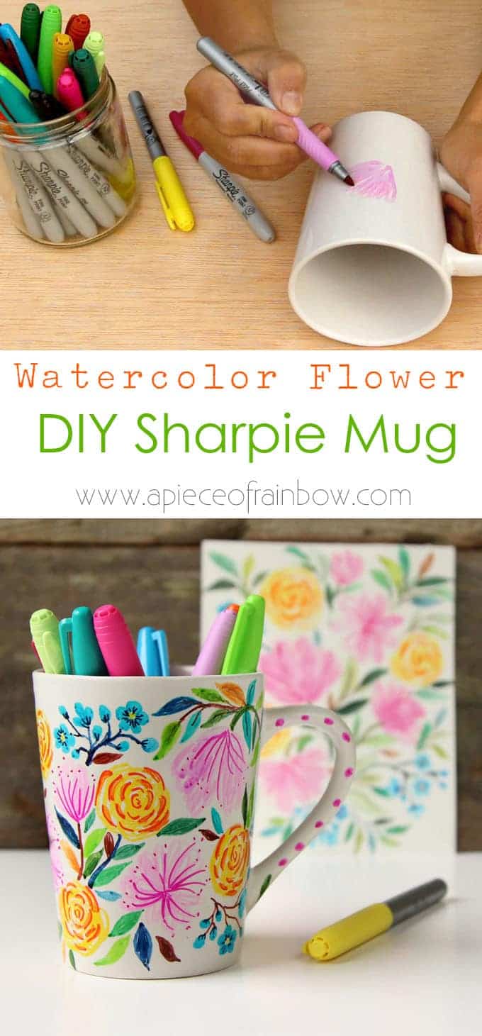 In this tutorial, I will share a detailed video and step by step photos on how to create watercolor style designs on a ceramic mug using regular sharpies without baking, and how to finish a DIY sharpie mug for different uses.  ( UPDATE: it’s been over a year and the mug is still looking great!)